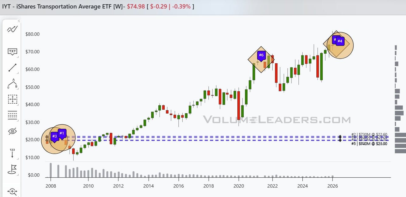 The prints in focus are not routine institutional flows. They are outsized, clustered, off‑exchange blocks that rank among the top VolumeLeaders positions in IYT — #1 and #3 in the 2008 cluster, #6 in 2021, and a new, similarly sized print in April 2026.