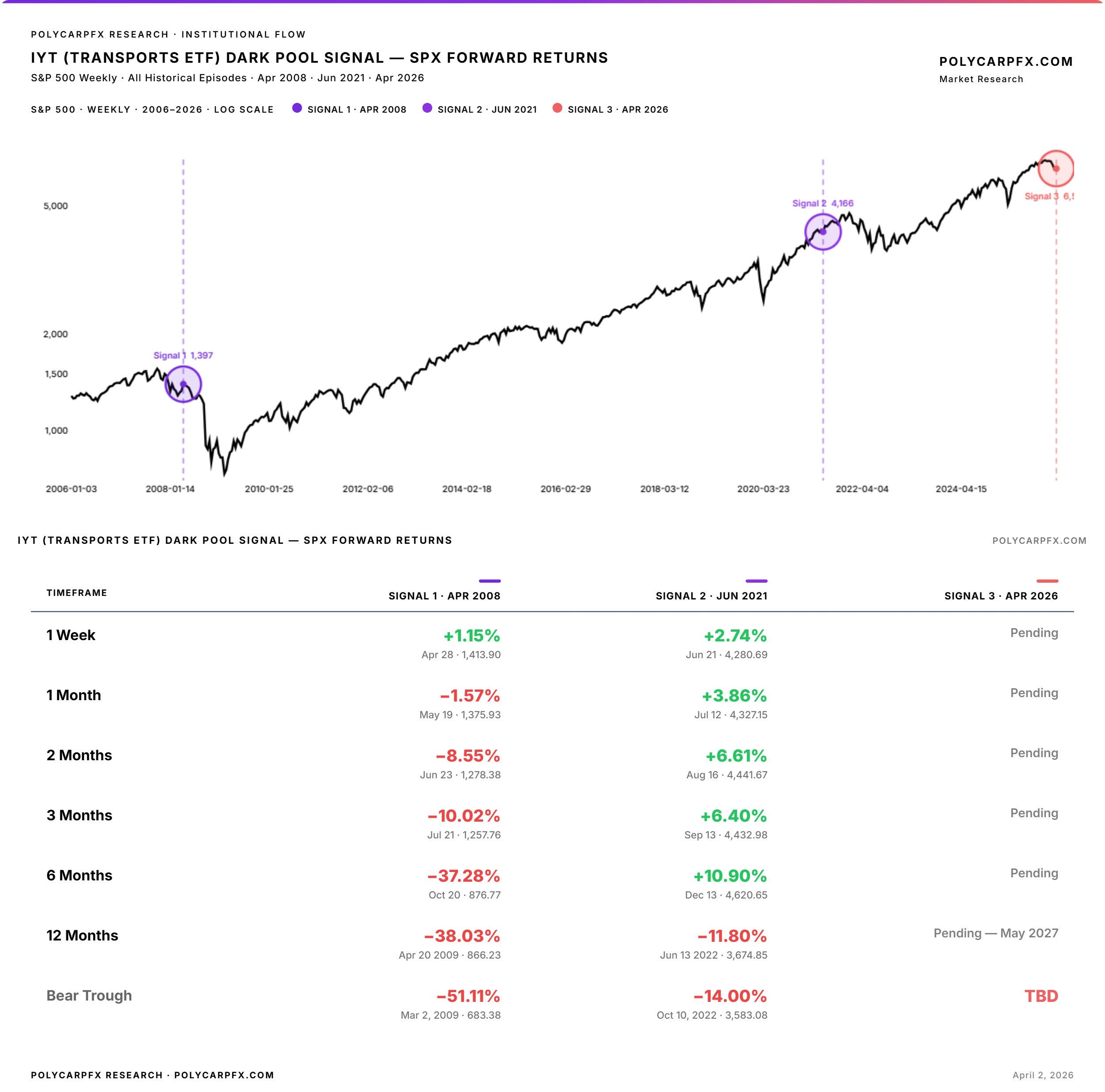 VolumeLeaders.com data flags two prior episodes where anomalously large IYT dark‑pool prints appeared near S&P 500 highs: April 21, 2008 and June 14, 2021. Both ultimately led to negative 12‑month SPX returns, despite very different macro backdrops. A third signal just fired in April 2026.