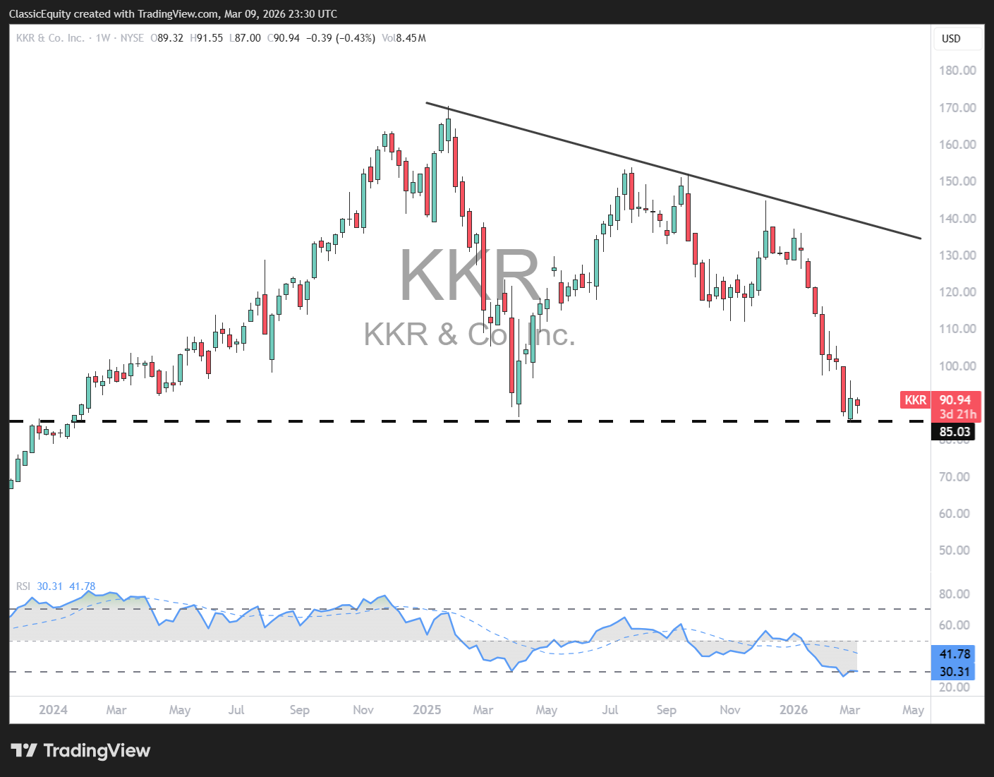 KKR - similar idea but lots of recent call volume, combined with this key 85 level dating back to 2023, think this could be a strong mean reversion trade. The 200D would be my target near 126.