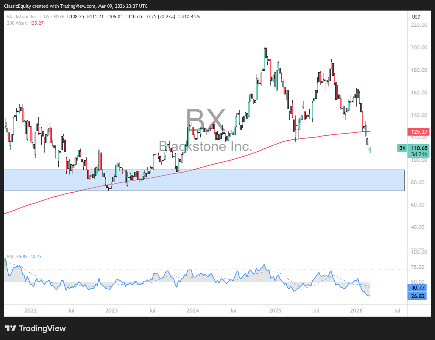 Blackstone - disclaimer, I bought shares today but fully expect it to be a choppy ride and potential for more lows sometime this year is strong, but with the weekly RSI washed out and pedigree of the company, I like it here. There is risk down to the 90 and 70’s levels but that would be an ideal spot, not the expectation it gets that low. For now I like it to play it for a bounce.