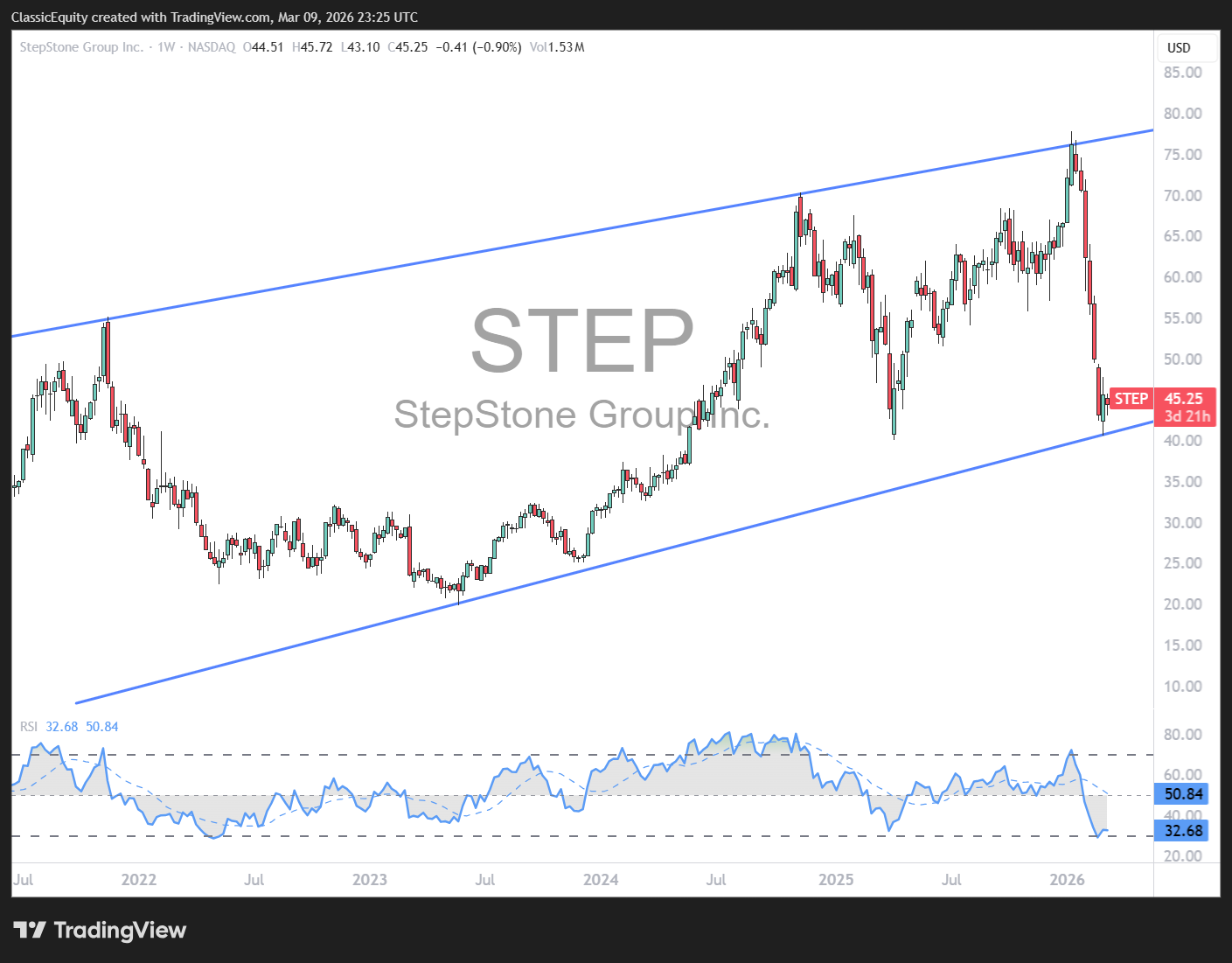 Stepstone - a smaller hidden gem in the sector, from low 20’s in 2022 it then proceeded to rise nearly 300%. Now reaching a similar washout level on Weekly RSI, I think this may be an opportunity. The risk is a similar move to 2022 where RSI bottomed but then the stock chopped lower into early 2023 (People forget early 2023 where everyone, myself included, was convinced another leg lower was coming in equities). I like scaling into the name in October and 1st week of November once overall market weakness should end based off Mid Term seasonals.