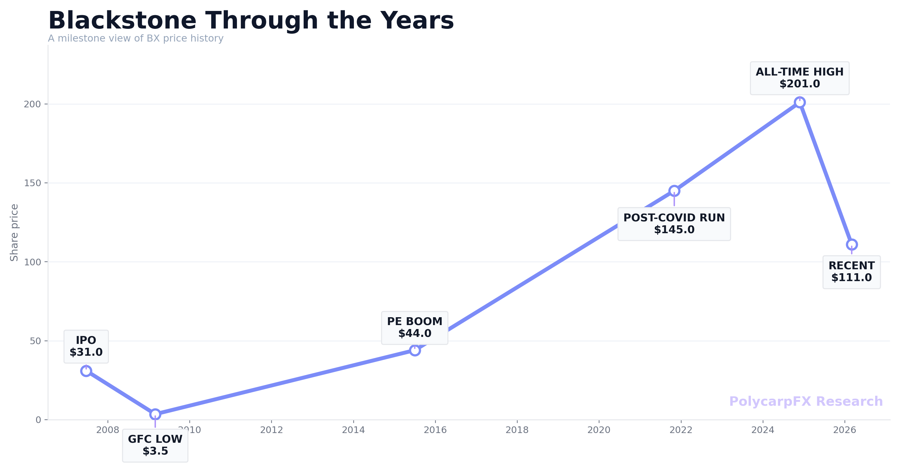 Cyclical beta in a fancy wrapper. In practice, BX behaves like a high‑beta financial with a structural growth story attached. When risk assets run, fundraising and realizations pop, and the stock overshoots. When liquidity tightens and exits slow, the multiple compresses and the earnings power gets questioned. You can see it in the way BX outperforms in easing cycles and underperforms when the Fed is in “higher for longer” mode.
