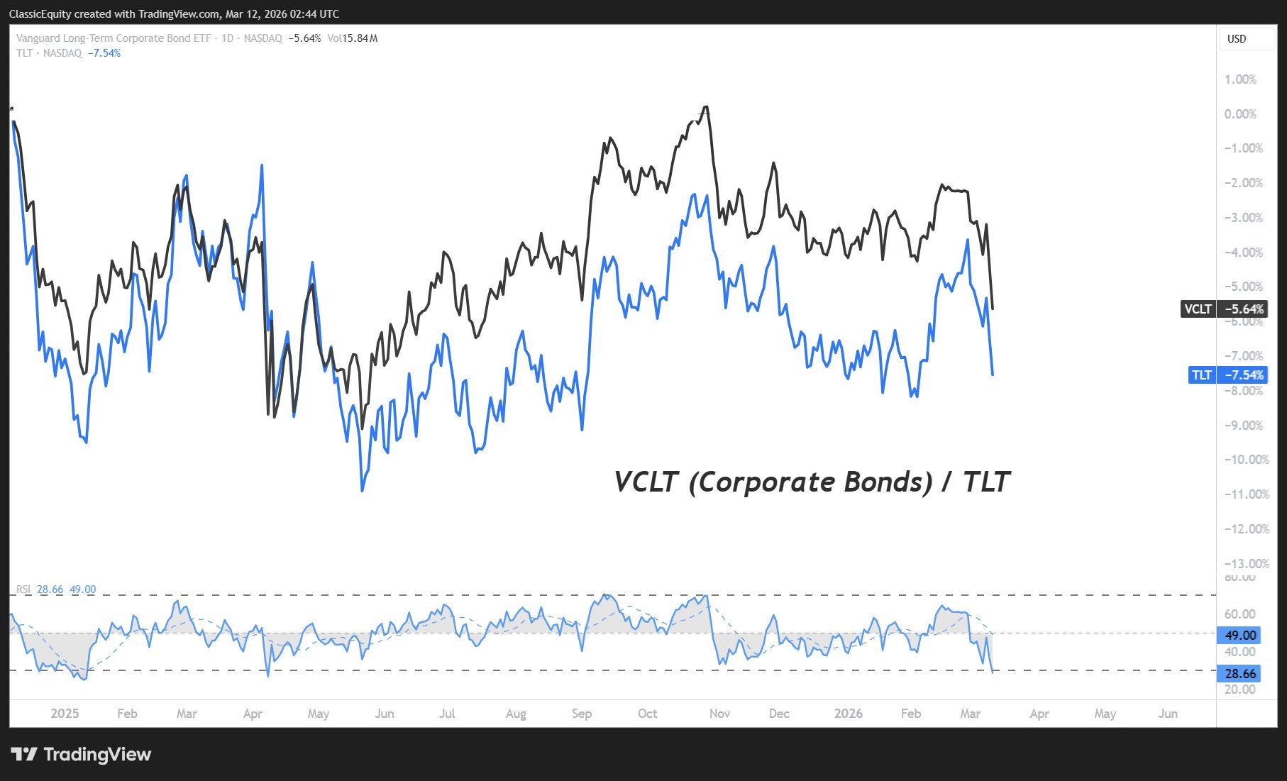 To me, this looks like a mispriced catalyst that also doubles as a hedge if a flight to safety theme takes hold later this year. Recently, several large prints hit VCLT (Corporate Bonds), which tends to track almost perfectly with TLT — and notably, those prints came after the selloff. I like the risk–reward setup here