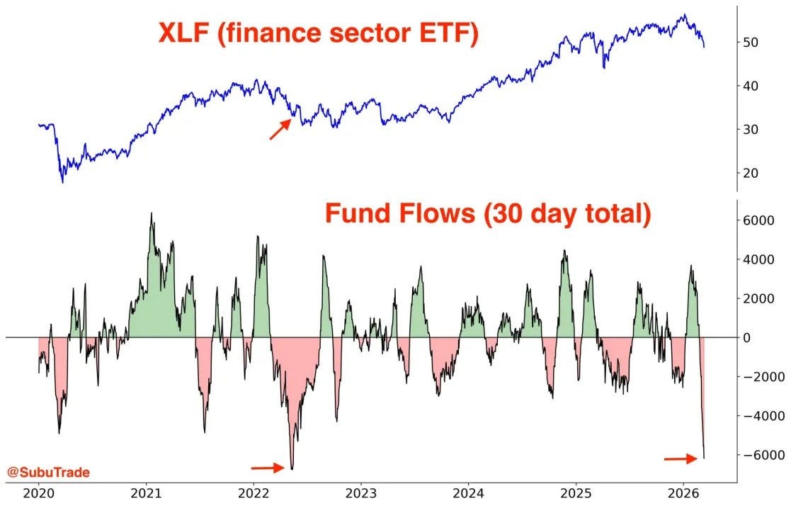 Financials continue to show weakness, with heavy outflows driven by rising credit risk and the latest Iran headlines weighing on the major indexes. Several core XLF components like GS, BLK, and AXP now sit in classic mean-reversion territory, with oversold weekly RSI readings and sentiment effectively dead on arrival to start the week. For traders who like to fade extremes, this basket is starting to line up as a potential bounce candidate rather than a fresh short.