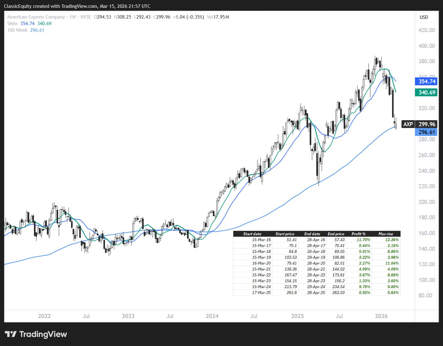 Speaking of financials, AXP (American Express) has a 100% hit rate over the past 10 years buying the week of 3/15 and holding through April. I love putting the odds in my favor and this is one piece of evidence I’m watching as a trade candidate for the week ahead.