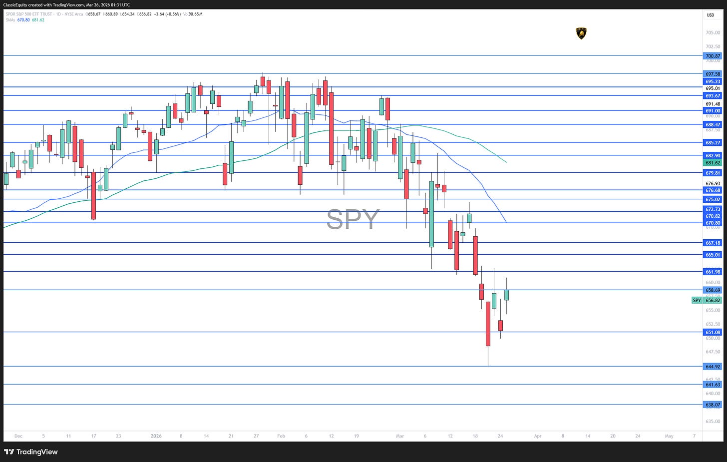 After the weakness on Friday, we kicked the week off with some green candles but since then we have stayed contained within that 659-651 range. On the daily candles below you can clearly see the range. When thinking about recent price action and the macro backdrop its easy to fall into a trap of having the right thesis on the market but just the wrong time frame. The time frame will depend on the setup in front of you and what is your actual goal. By goal I mean are you an active day or swing trader? Are you looking solely for medium to longer term investments?