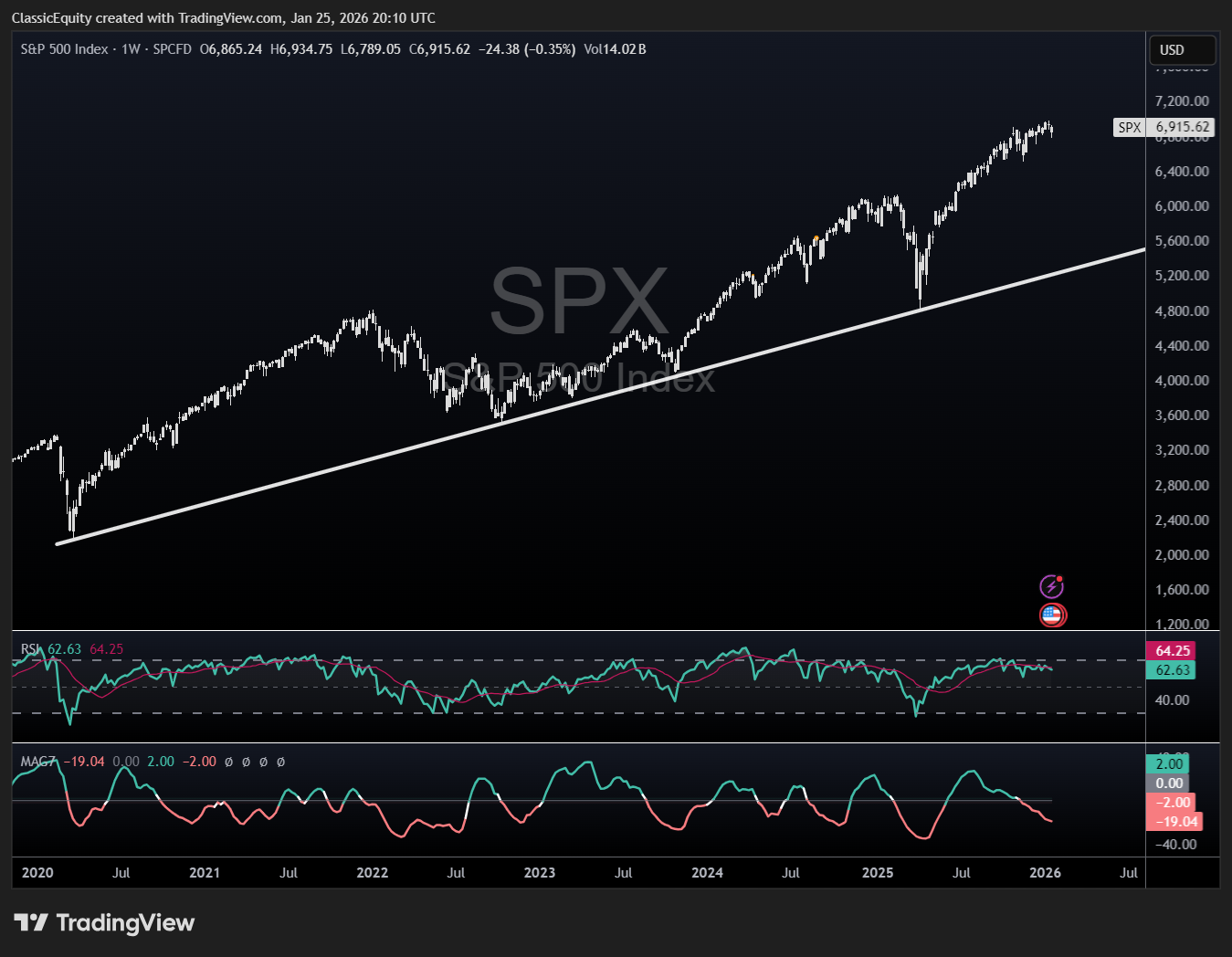 When I throw my own indicators on it, not nearly as strong a read at current levels, although I do think it supports a buy the dip scenario if we see MAGS names oversold into earnings.