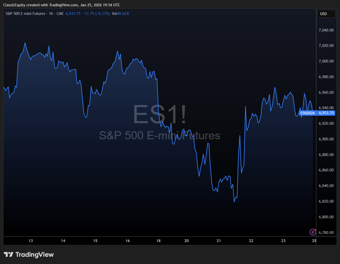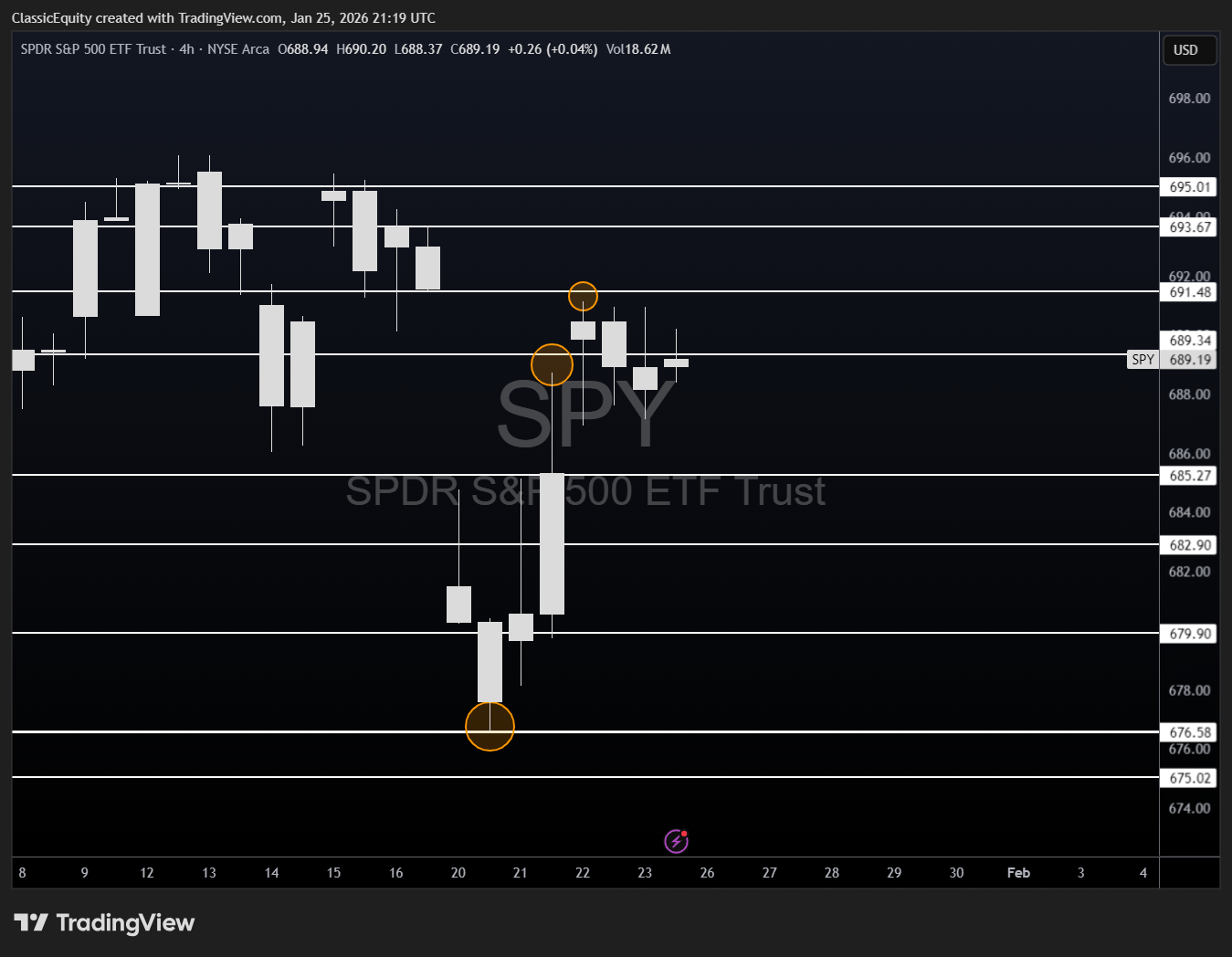Last week reminded us how quickly sentiment can flip. We came into the shortened week leaning cautious, locked in profits on our post‑MLK puts, and then spent the next few sessions trading the SPY levels we mapped out as volatility spiked and price ping‑ponged between support and resistance. By Friday, hedging flow and a pick‑up in dark‑pool activity were hinting that it might be time to dial back risk, and that caution looks even more justified after a weekend full of fresh geopolitical and domestic headlines—from renewed unrest in Minnesota to nuclear‑intelligence allegations out of China, rising Iran tensions, and shutdown odds pushing higher.