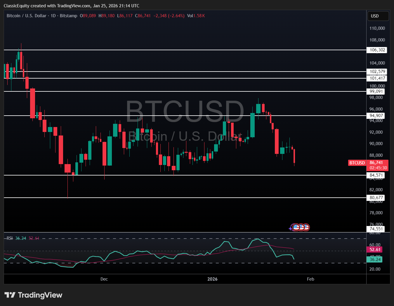 With a weekend full of fresh headline risk and Friday’s late‑day hedging flow, I’m coming into the week expecting an initial risk‑off open, and Bitcoin’s overnight weakness is already echoing that tone. The playbook from here is less about guessing the exact gap and more about tracking how price behaves into and through the FOMC and heavyweight earnings: does early selling get absorbed and set the stage for a squeeze higher as event risk clears, or do we see failed bounces that confirm a deeper de‑risking into the end of January?